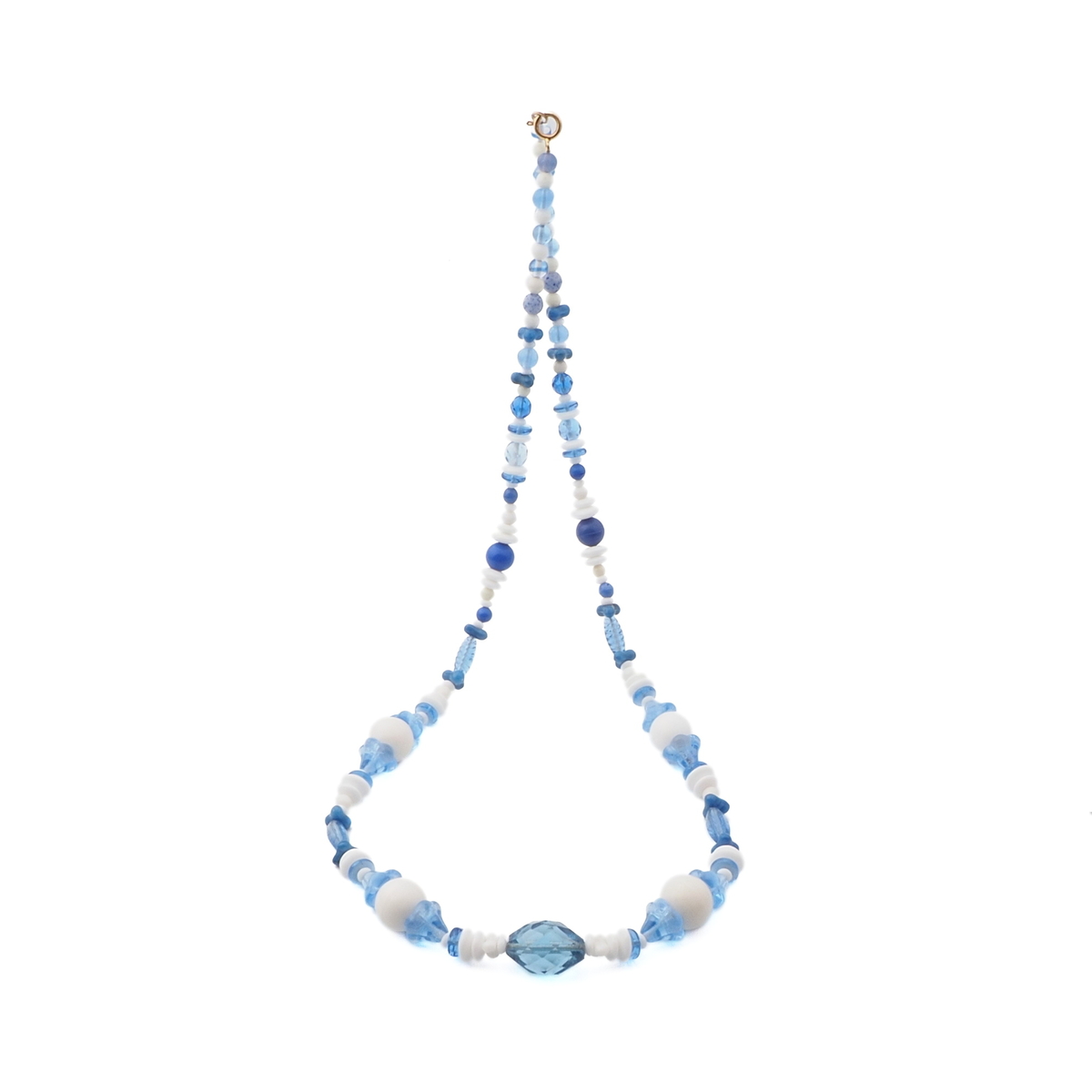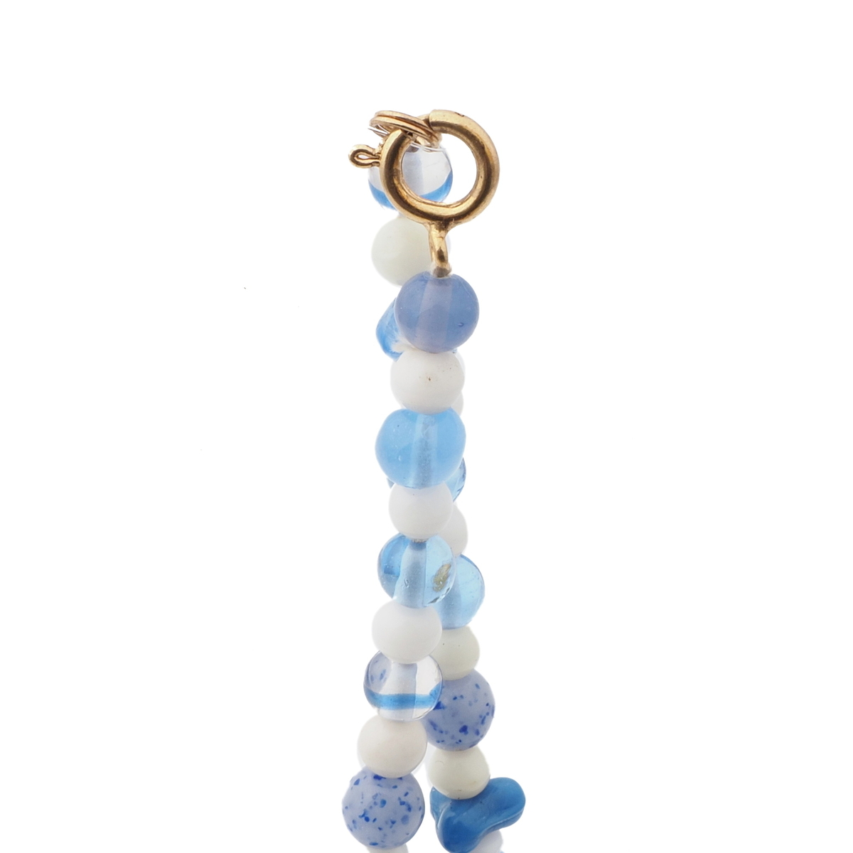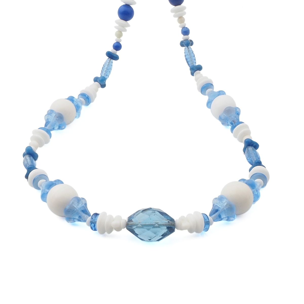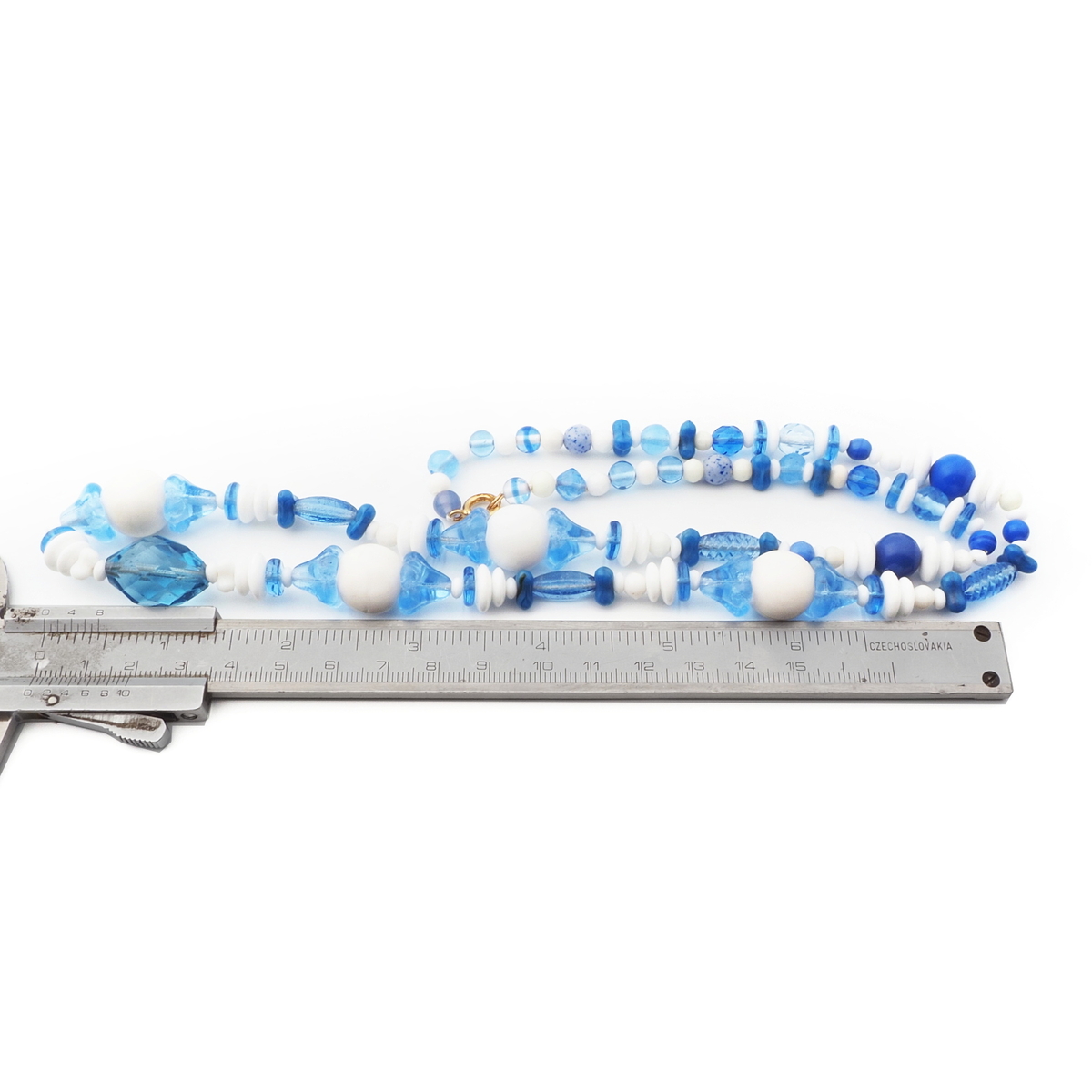 Vintage Czech necklace with a stunning selection of glass beads. A wonderful selection of blue and white round, rondelle, flower and oval glass beads in a variety of sizes. Gold tone clip clasp closer. This necklace is from the 1970's and is in excellent condition for the age, having been in storage for over 50 years. Many of the beads are older, from the Deco era.